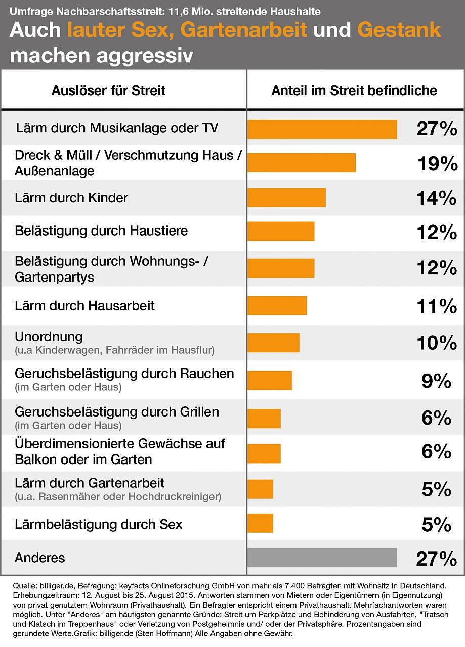 Gerichte müssen sich zwar regelmäßig in Deutschland mit der Frage beschäftigen, wie hoch eine nachbarliche Hecke wirklich sein darf. Auch ist ein gern vor Gericht ausgetragenes Thema der lästige riesige Baum-Ast, welcher einem die Sonne nimmt, oder das Balkon-Efeu des Nachbarn, welches für Mäuse in der Küche verantwortlich gemacht wird. Doch wirklich häufig werden über solche Dinge zwischen den Deutschen keine Diskussionen geführt. Nur sechs Prozent der 11,6 Millionen deutschen Haushalte, die sagten, sie hätten aktuell oder in der Vergangenheit Streit mit den Nachbarn, gaben als Grund an, dieser basierte auf überdimensionierten Gewächsen.Ähnlich sieht es mit dem Thema Sex in Nachbars Wohnung oder Haus aus. Denn auch wenn einige das rhythmische Quietschen des Bettes, lustvolles Gestöhne oder Dirty Talking sexy finden: Für Nachbarn kann es die Hölle sein. So gaben fünf Prozent der 11,6 Millionen deutschen Haushalte an, die nach eigener Auskunft schon Streit mit dem Nachbarn gehabt hätten, genau dieses Thema als Grund an. Neben mir wohnte eine Studentin, die machte es mit ihrem Freund immer besonders laut, meint eine Münchnerin. Sie habe sich regelmäßig etwas angewidert die Ohren zuhalten müssen.