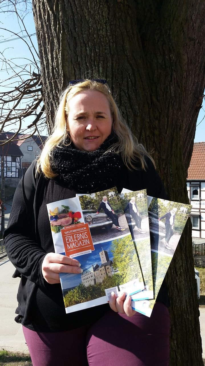 Ute Rust (Welterberegion Wartburg Hainich e.V.) präsentiert das neue Erlebnismagazin der Welterberegion Wartburg Hainich. (Foto: Welterberegion Wartburg Hainich )