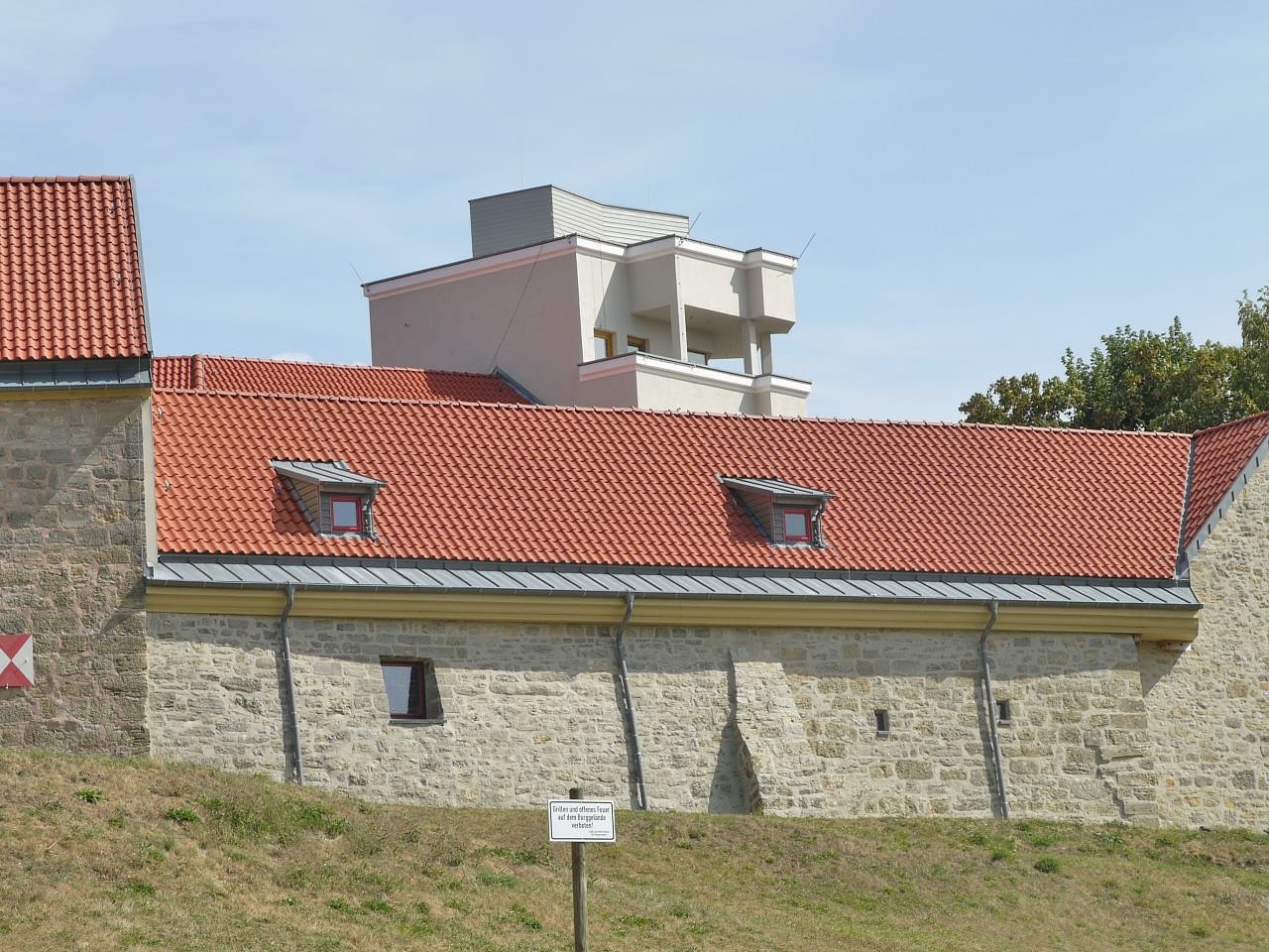 Eine ehemalige Baulücke aus den 1960-er Jahren – hier befand sich vormals ein Wirtschaftsgebäude - wurde mit einem Neubau von 19,70 Metern Höhe geschlossen und kann nach Fertigstellung als Aussichtsplattform genutzt werden.