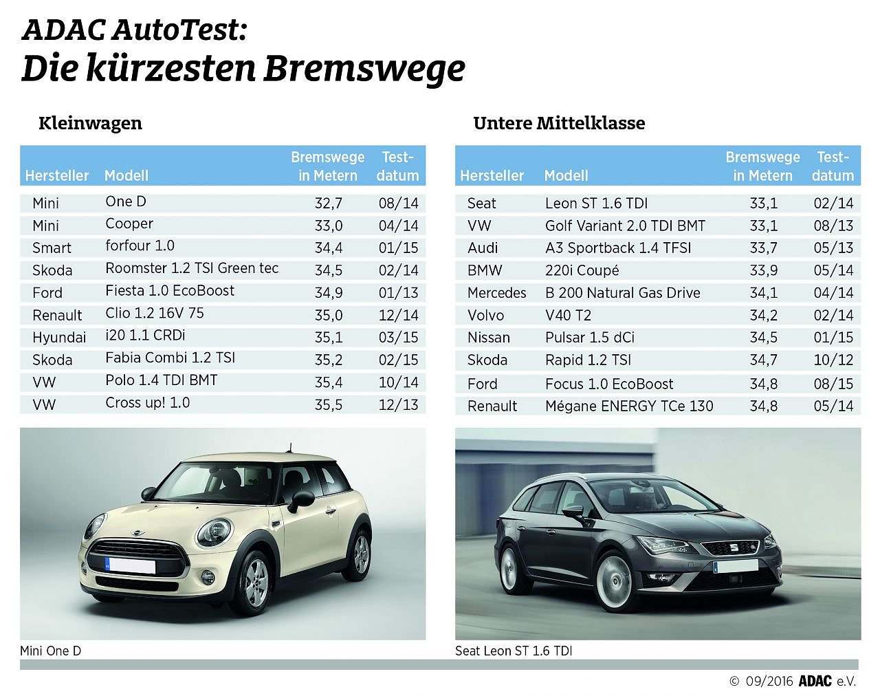 Der ADAC hat in den vergangenen vier Jahren mehr als 500 Autos auf ihre Bremswerte untersucht. Ergebnis: Schon im Kleinwagensegment und in der unteren Mittelklasse (Golfklasse) erreichen viele Pkw sehr gute Ergebnisse. Bester Kleinwagen war der Mini One D, der bei einer Geschwindigkeit von 100 km/h nach 32,7 Metern zum Stehen kam...
