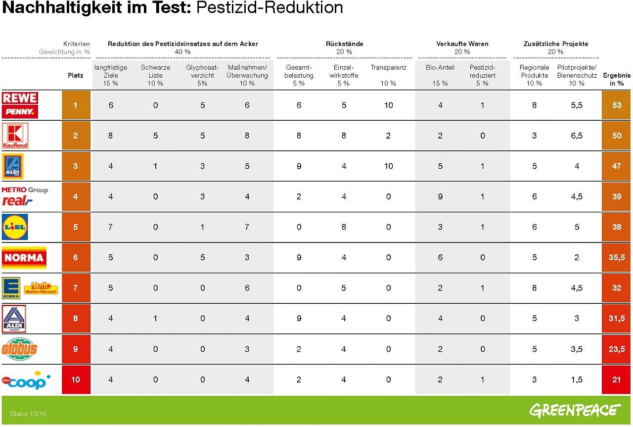 In elf Kategorien prüfte Greenpeace die Handelsketten: Gefragt wurde, wie sich Rewe, Lidl und Co. für weniger Pestizide einsetzen. Dazu zählen die Zusammenarbeit mit Landwirten und eigene Laboranalysen. Punkte wurden unter anderem auch für Transparenz, Bienenschutz und einen hohen Anteil an Bio-Produkten vergeben. Auf Rewe/Penny folgen Kaufland, Aldi Süd, Metro und Lidl im Ranking. Aldi Süd bietet eine besonders transparente Veröffentlichung von Pestizidanalysen, Lidl hat einen vergleichsweise strikten Grenzwert für Pestizide in Produkten. In fast allen Kategorien schlecht abgeschnitten haben Norma, Edeka/Netto, Aldi Nord, Globus und Coop.