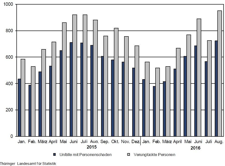 Die Anzahl der Unfälle mit Personenschaden erhöhte sich von 689 Unfällen im August 2015 um 5,1 Prozent auf 724 Unfälle im August 2016. Dabei verunglückten 951 Personen, 13 wurden getötet und 938 Personen wurden verletzt.