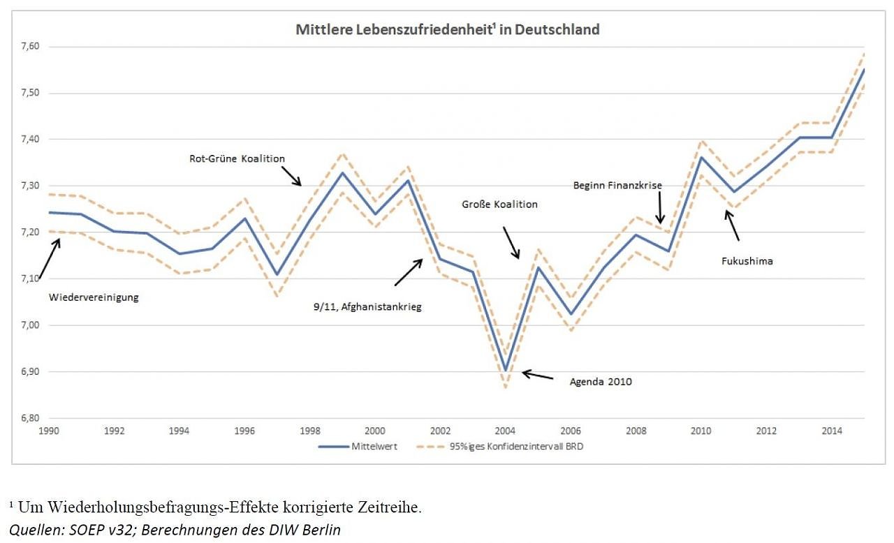 Das SOEP befragt seit seinem Gründungsjahr 1984 jährlich mehr als 10.000 Personen zu ihrer Lebenszufriedenheit (Glück). Auf einer Skala von null bis zehn geben die Befragten an, wie zufrieden sie derzeit alles in allem mit ihrem Leben sind. Die Zahl null bedeutet ganz und gar unzufrieden, zehn hingegen steht für ganz und gar zufrieden. Die sogenannte Glücksforschung hat sich in den vergangenen Jahren zu einem der wichtigsten Forschungsfelder auf der Basis von SOEP-Daten entwickelt. Bis heute sind mehr als 700 SOEP-Studien zum subjektiven Wohlbefinden, zur Zufriedenheit und zum Glück Zufriedenheit erschienen. Daten zur persönlichen Lebenszufriedenheit sind eine wichtige Größe bei der Messung von Lebensqualität, sagt SOEP-Direktor Jürgen Schupp. Wer Aussagen zur Lebensqualität treffen möchte, muss neben den objektiven Lebensbedingungen auch die subjektive Lebenszufriedenheit im Blick haben.Zum SOEP