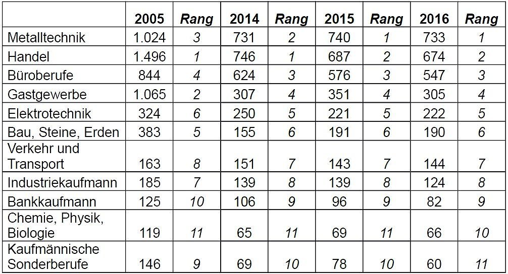 So wurden im vergangenen Jahr zwei von fünf Ausbildungsverträgen (41 Prozent) im Bereich der industriell-technischen Berufe abgeschlossen, das ist der höchste Wert seit 1993. Rückgänge wären ebenfalls bei Versicherungsberufen sowie im Gastgewerbe zu verzeichnen.
