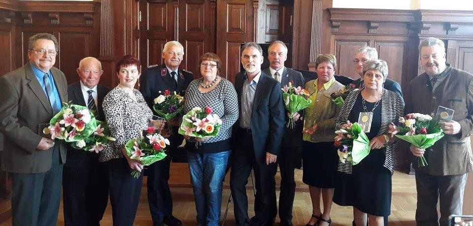 Von links: Bodo Weber, Eberhard Born, Viola Koppe, Erhard Käsebier, Hella Doppleb, Landrat Harald Zanker, Lutz Schreiber, Getraude Winter, Gerhard Wegerich, Bärbel Sola und Erik Eisfeld bei der Preisverleihung