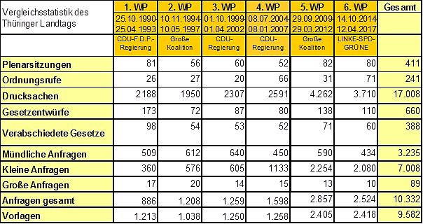 Am 14. Oktober 2014 trat der Thüringer Landtag in seiner sechsten Wahlperiode erstmals zusammen. Seitdem sind 30 Monate vergangen, womit die Hälfte der fünfjährigen Legislaturperiode verstrichen ist. Im Detail weist die Parlaments-Statistik folgende Zahlen aus: