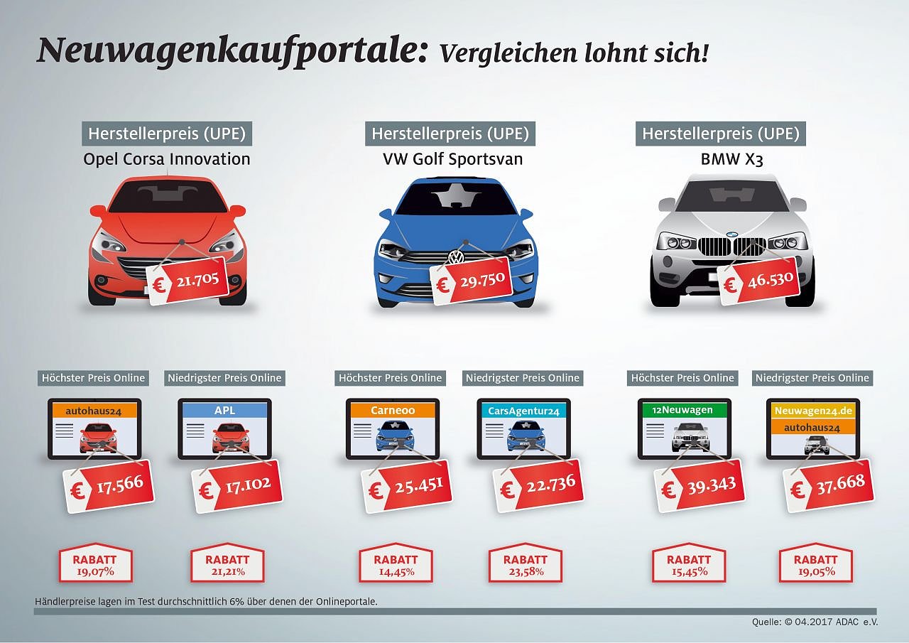 Der Weg zum neuen Auto führt heutzutage nicht mehr nur zum Händler, sondern immer öfter ins Internet. Und wer online kauft, kann tatsächlich Geld sparen: Im Durchschnitt sind Fahrzeuge im Internet rund 18 Prozent günstiger als der ausgewiesene Listenpreis...