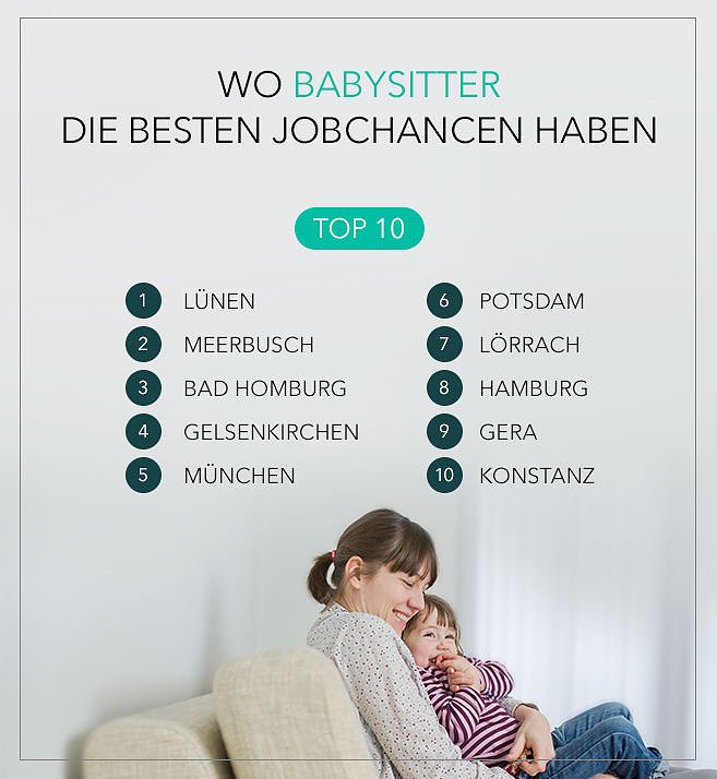 Den Titel als Beste Stadt für Babysitter hat die in Westfalen gelegene Stadt Lünen verdient. Hier haben Babysitter die größten Chancen, eine Anstellung zu finden. Ebenfalls auf dem Treppchen stehen dürfen Meerbusch (bei Düsseldorf) und Bad Homburg (bei Frankfurt). Daneben liegen Großstädte wie München und Hamburg gut im Rennen. Wer sich hier Geld dazu verdienen möchte, hat beim Babysitting besonders gute Chancen.