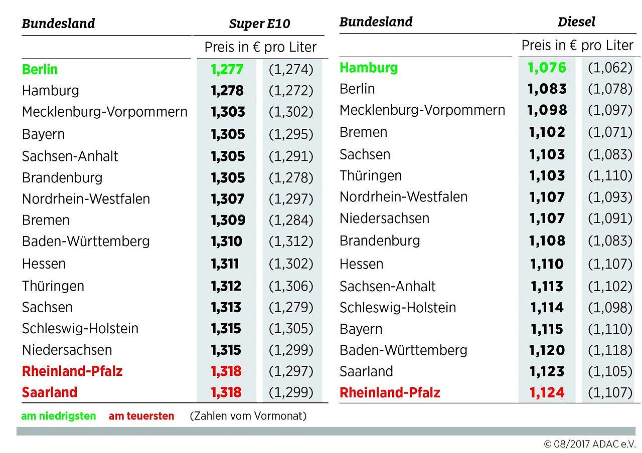 Schlusslichter im Benzin-Ranking sind das Saarland und Rheinland-Pfalz mit einem Durchschnittspreis von jeweils 1,318 Euro je Liter. Die Preisdifferenz zwischen teuerstem und günstigstem Bundesland beträgt damit bei Benzin mehr als vier Cent.
