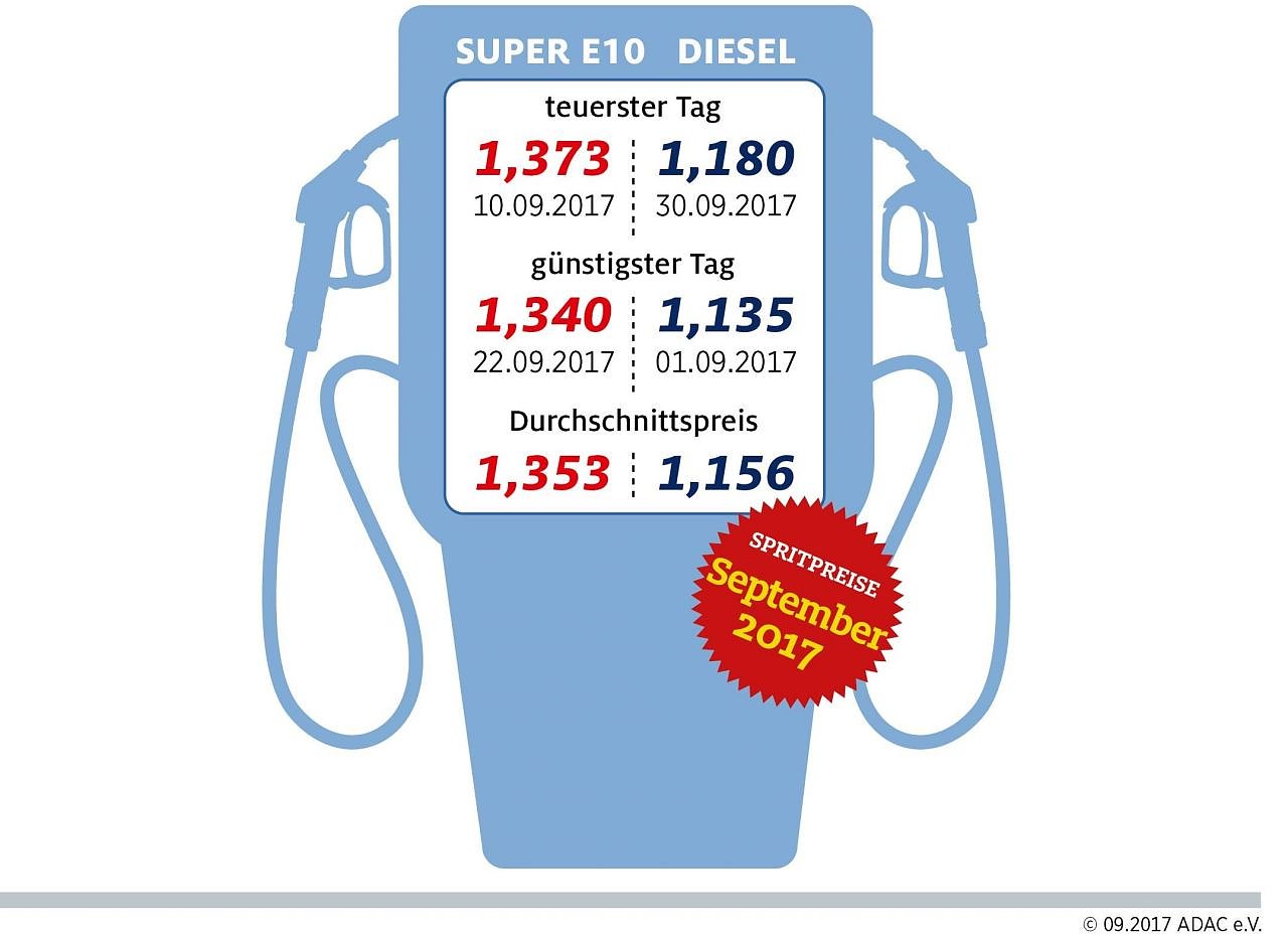 Damit war dieser Kraftstoff in jedem Monat des Jahres teurer als im jeweiligen Vorjahresmonat. Teuerster Tanktag für Super E10 war der 10. September mit 1,373 Euro und der 30. September für Diesel (1,180 Euro). Dieselfahrer tankten am günstigsten am 1. September: Ein Liter kostete zum Monatsbeginn 1,135 Euro. Für Super E10 mussten die Autofahrer am 22. mit 1,340 Euro je Liter am wenigsten bezahlen.