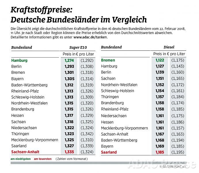 Die Auswertung des ADAC ist eine Momentaufnahme von heute Vormittag, 11 Uhr. Ermittelt wurden Durchschnittswerte an allen Tankstellen je Bundesland, im Einzelnen können die Preise erheblich davon abweichen. Informationen über die günstigste Tankstelle in der Nähe gibt es über die App „ADAC Spritpreise“ sowie über www.adac.de/tanken.