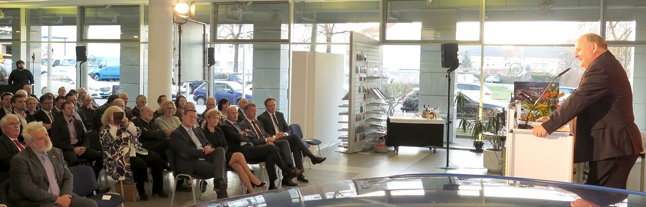 Gastgeber Helmut Peter bei seiner BegrüßungSchon im Vorfeld verursachte der Gast einigen politischen Wirbel, denn plötzlich wurde aus der MIT-Tradition ein Thüringischer Polit-Staatsakt und vermutlich war es denn auch eine Premiere, dass ein LINKE(r) Ministerpräsident Gast eines Empfangs einer CDU-Organisation wurde.