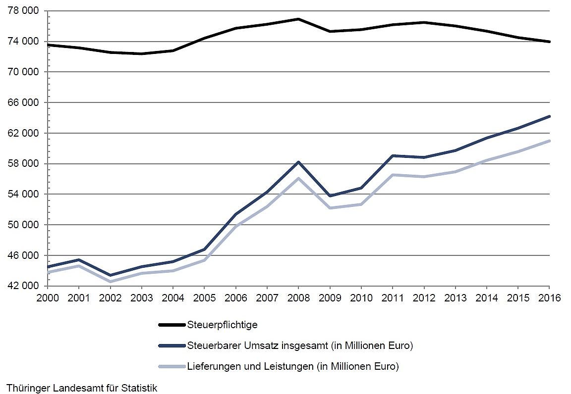 Umsatzsteuerpflichtige, Steuerbarer Umsatz sowie Lieferungen und Leistungen von 2000 bis 2016 in ThüringenGrundlage der Umsatzsteuerstatistik sind die Umsatzsteuer-Voranmeldungen, zu deren Abgabe alle Unternehmen mit einem steuerbaren Umsatz über 17 500 Euro im Vorjahr verpflichtet sind. Im Vergleich zu 2015 konnten die Thüringer Unternehmen ihren steuerbaren Umsatz um 2,5 Prozent erhöhen, während die Zahl der Unternehmen um 522 oder 0,7 Prozent zurückging.