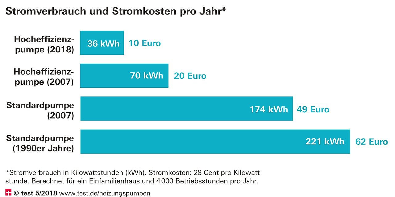Bei den Effizienzsiegern im Test fallen in einem typischen Einfamilienhaus nur noch 8 bis 9 Euro Stromkosten im Jahr an. Eine Standardpumpe aus dem Jahr 2007 benötigt mit 49 Euro pro Jahr etwa das Fünffache, Standardpumpen aus den 90ern sogar noch mehr. Nach weniger als 10 Jahren sind dann die Kosten für die neue Pumpe wieder drin – und die Umwelt profitiert sofort, sagt Testleiter Dr. Peter Schick. Oft gehe es sogar schneller, weil viele alte, ungeregelte Modelle rund um die Uhr laufen, selbst im Sommer.
