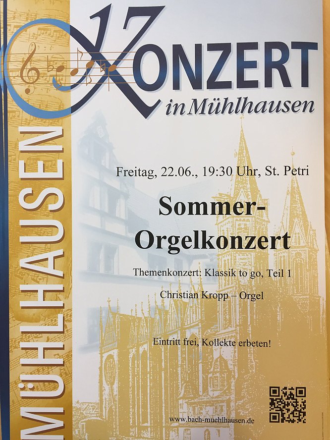 Als einen Höhepunkt der Musiksaison in Mühlhausen spielt nämlich der Organist der Gemeinde, Christian Kropp, ein Orgelkonzert mit dem Thema: Klassik to Go, Teil 1.