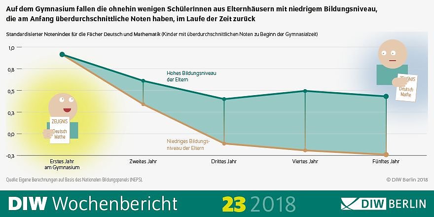 Die Ergebnisse zeigen, wie wichtig der Bildungshintergrund der Eltern für die Schulnoten ihrer Kinder noch immer ist, erklärt Weinhardt. Offenbar hängt nicht nur die Frage, ob man überhaupt auf ein Gymnasium geht, davon ab, sondern auch die Entwicklung der Noten im weiteren Verlauf der Schulzeit.