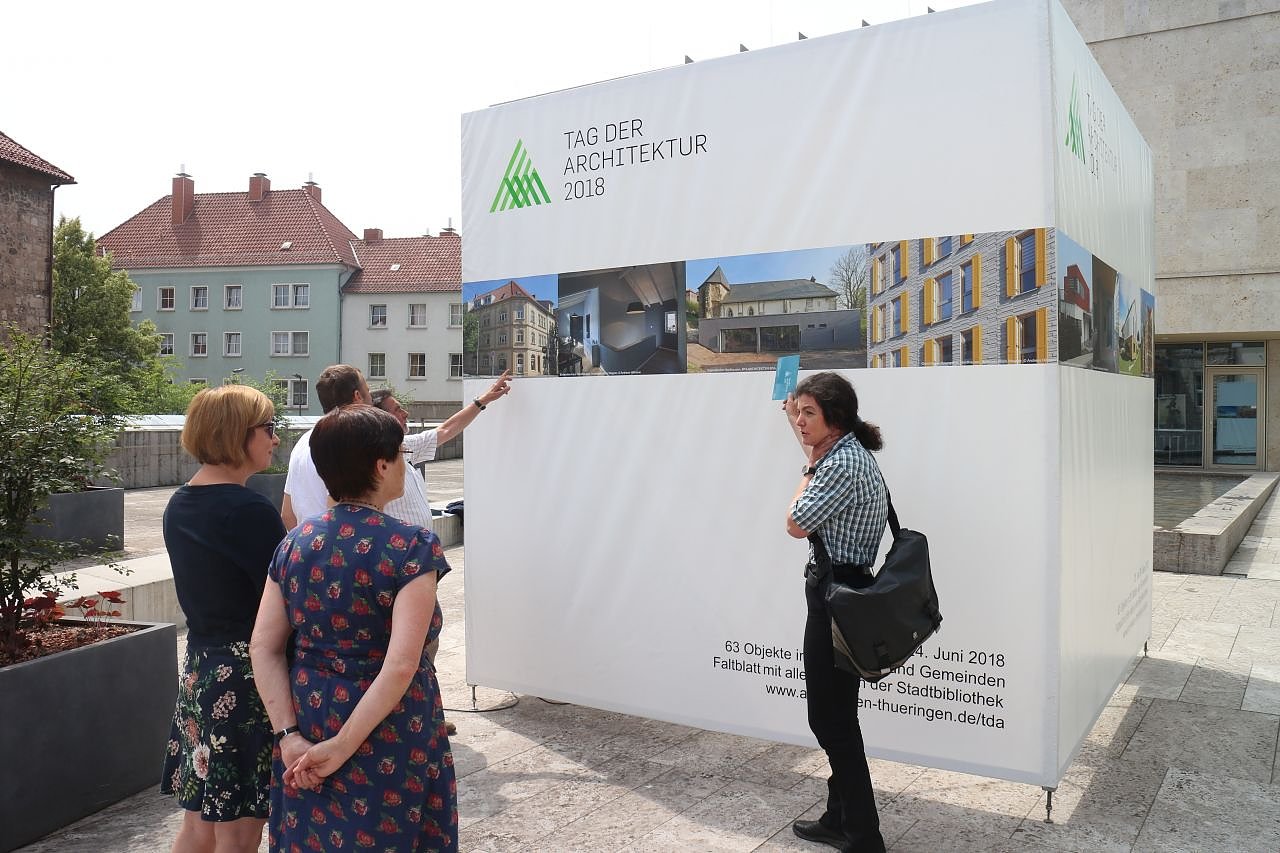 Auf dem Platz vor der Bibliothek steht seit heute Nachmittag ein "Leuchtkubus" auf dem einige der 68 Gebäude vorgestellt werden, die man in diesem Jahr in Thüringen wird besichtigen können.
