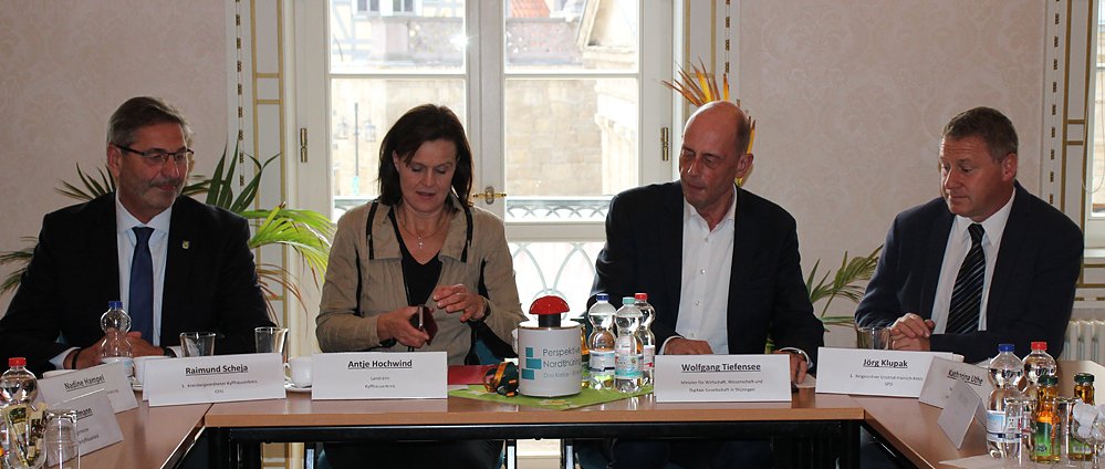Im Sitzungszimmer des Landratsamtes hatten sich u.a. Landrätin Antje Hochwind aus dem Kyffhäuserkreis, Jörg Klupak als Beigeordneter des Unstrut-Hainich-Kreises und Siegfried Gentele aus dem Landkreis Nordhausen eingefunden, aber auch Landtagsmitglied Dorothea Marx, Bürgermeister (Steffen Grimm - Sondershausen, Steffen Gröbel - Ebeleben) sowie Vertreter der Wirtschaft, der IHK und Mitarbeiter des Regionalmanagements.