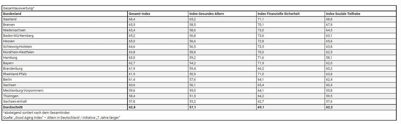 Angeführt wird das Ranking vom Saarland (68,4), Schlusslicht im Ländervergleich ist Sachsen-Anhalt mit 57,8 Punkten. Der Bundesdurchschnitt liegt bei 62,8 Zählern.