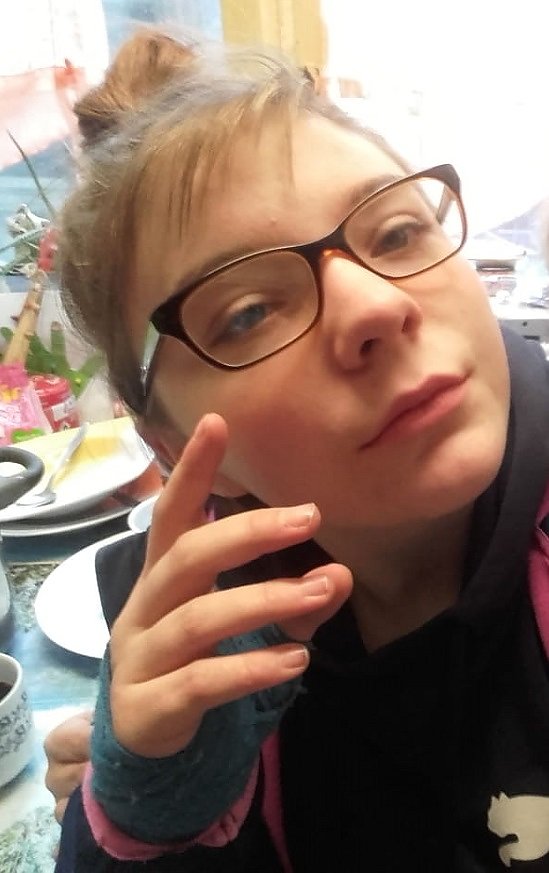 Autor: redAnna-Sophie trägt eine Brille. Bekleidet ist sie vermutlich mit einer Jeansjacke, einem blauen Kapuzenpullover mit der Aufschrift PUMA und einer schwarz-weiß karierten Stoffhose.