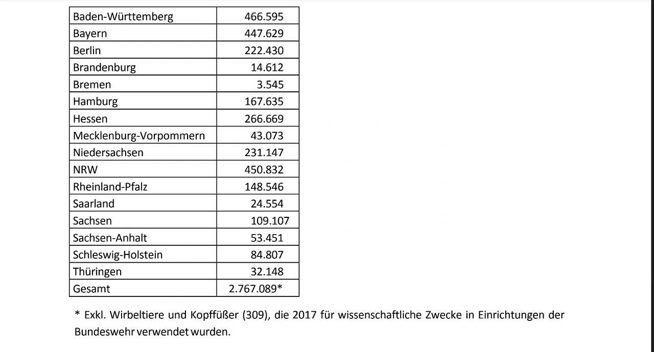 Mit insgesamt 466.595 Tieren ist Baden-Württemberg erneut Spitzenreiter im Verbrauch von Versuchstieren zu wissenschaftlichen Zwecken. Es folgen Nordrhein-Westfalen mit 450.832 und Bayern mit 447.629 Tieren. Fast die Hälfte aller zu wissenschaftlichen Zwecken verwendeten Tiere wird in diesen drei Bundesländern eingesetzt.