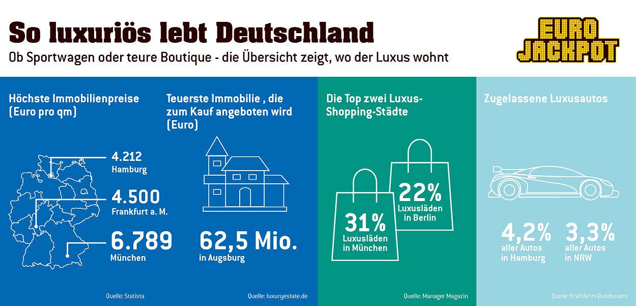 Die meisten Luxusautos sind auf Hamburgs Straßen unterwegs und die meisten Luxusläden findet man in München. Hätten Sie’s gewusst? Wo in Deutschland welche Art von Luxus wohnt, zeigt die Übersicht von Eurojackpot...