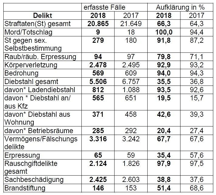 Sehr positiv zu vermelden ist die 100prozentige Aufklärungsquote bei den schweren Straftaten wie Mord und Totschlag. Insgesamt wurden hier im abgelaufenen Jahr neun solcher Straftaten verzeichnet. Im Jahr 2017 waren es 18 Taten.