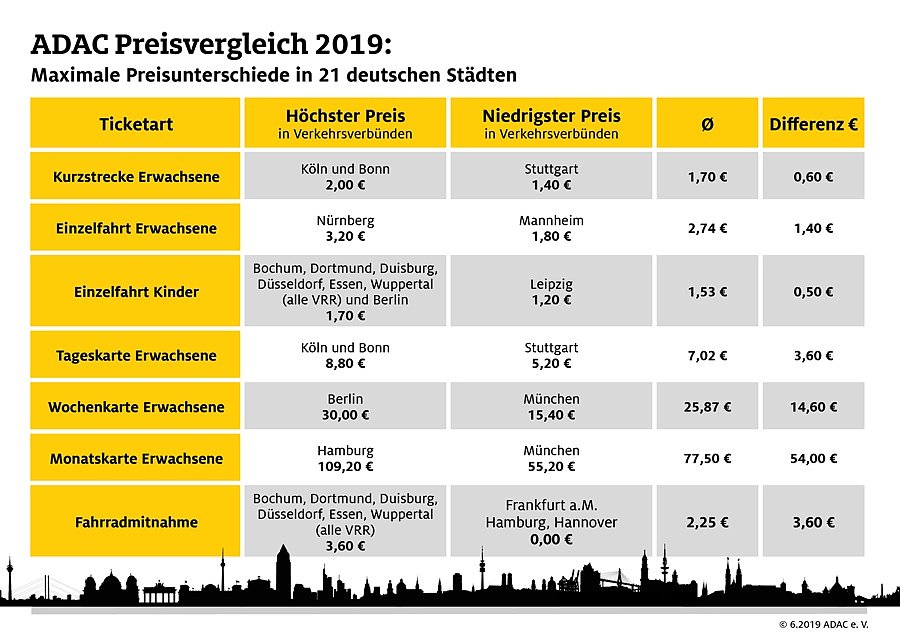 Im Rahmen des Preisvergleichs hat der ADAC die Preise der sieben relevantesten Ticketarten im jeweiligen Stadtgebiet deutscher Städte über 300.000 Einwohner erhoben: Einzelfahrt und Kurzstrecke für Erwachsene, Einzelfahrt für Kinder, Tages-, Wochen- und Monatskarte für Erwachsene sowie Ticket für Fahrräder. Diese Tickets waren weitgehend durchgängig in allen Städten erhältlich. Recherchiert wurden die Preise jeweils auf den Webseiten der Verkehrsverbünde im Zeitraum vom 8. Januar bis zum 3. Mai 2019. Die in München zum 15. Dezember geplanten neuen Preise sind noch nicht berücksichtigt. Richtig bleibt aber, dass Kunden auch nach der Preisreform für eine Monatskarte den günstigen Preis von 55,20 Euro zahlen.