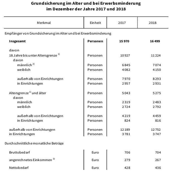 Der durchschnittliche monatliche Bruttobedarf lag im Dezember 2018 bei 704 Euro. Ein Jahr zuvor betrug er 706 Euro. Nach Abzug des angerechneten Einkommens in Höhe von 267 Euro (2017: 279 Euro) ergab sich je Empfänger im Dezember 2018 ein Nettobedarf von 436 Euro. Ein Jahr zuvor betrug dieser 428 Euro.
