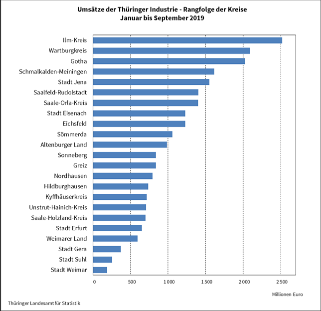 Die Betriebe von zehn Landkreisen erwirtschafteten jeweils ein Umsatzvolumen von über einer Milliarde Euro. So verbuchte der Ilm-Kreis als Umsatzspitzenreiter einen Umsatz in Höhe von rund 2 518 Millionen Euro, gefolgt vom Wartburgkreis mit 2 091 Millionen Euro, dem Landkreis Gotha mit 2 028 Millionen Euro sowie dem Landkreis Schmalkalden-Meiningen mit 1 614 Millionen Euro Umsatz.
