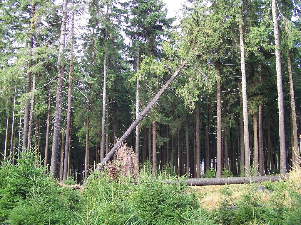 Typische Schäden mittelstarker Orkanstürme: Fichten-Einzelwürfe, die aber bei der derzeitig kritischen Forstschutzsituation für Waldbesitzer und Förster viel Arbeit bedeuten. Sie müssen schnellsten gefunden, aufgearbeitet und aus dem Wald gebracht werden (Foto: Dr. Horst Sproßmann)