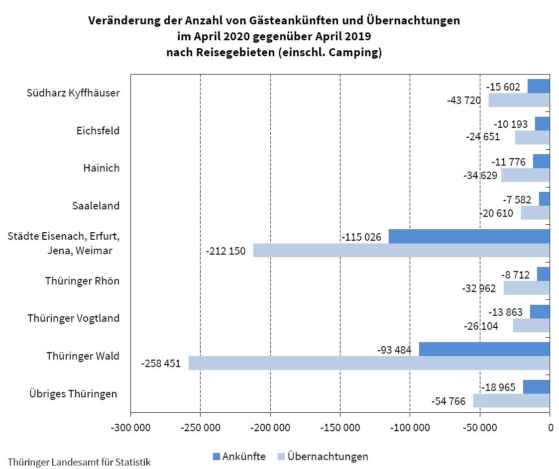 Im April 2020 wurden nach Mitteilung des Thüringer Landesamtes für Statistik in den Thüringer Beherbergungsstätten (mit zehn und mehr Betten) und auf Campingplätzen (ohne Dauercamping) insgesamt 18.500 Gästeankünfte gezählt. Das waren 94,1 Prozent weniger Ankünfte (-295.200) als im April 2019...