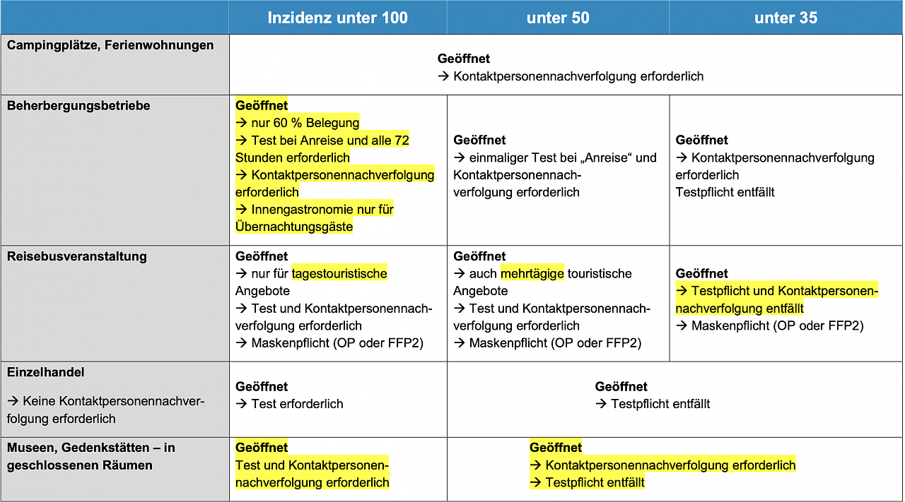 In Sachen Kontaktbeschränkungen ändert sich einiges, je nach Inzidenz werden wieder Treffen mit mehreren Personen möglich. Veranstaltungen in geschlossenen Räumen sind mit bis zu 10 Personen möglich bei einem Wert unter 50, müssen aber 10 Tage im Vorfeld angemeldet werden. Liegen die Werte unter 35 beträgt die Anzeigepflicht zwei Werktage. Die Gastronomie darf im Außenbereich mit Kontaktnachverfolgung öffnen, unter 35 entfällt auch diese. Im Innenbereich werden Öffnungen ab unter 50 möglich, unter 35 entfällt die Testpflicht.