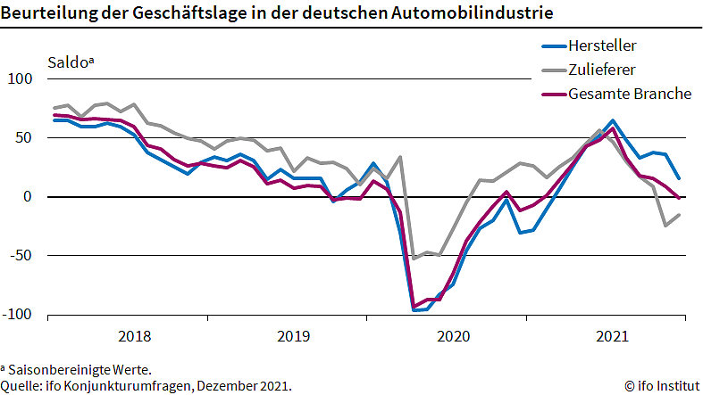 „Diese abermalige Verschlechterung ist von den Herstellern getrieben, nicht von den Zulieferern“, sagt Oliver Falck, der Leiter des ifo Zentrums für Industrieökonomik und neue Technologien. Der Lageindikator für die Hersteller fiel deutlich auf 15,6 Punkte, nach 36,5 im November.