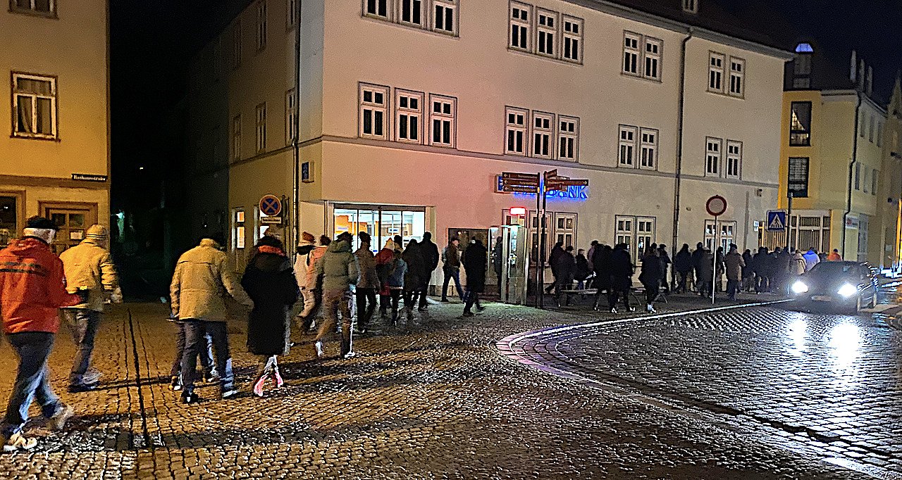 Nachdem bereits gestern gut sechzig mit der Coronapolitik unzufriedene Bad Langensalzaer sich auf den Weg durch die Stadt gemacht hatten, kamen am Abend reichlich einhundert Personen von jung bis alt zusammen, um in einem knapp einstündigen Protestmarsch durch die Stadt zu ziehen. Erstmals wurden sie dabei nicht von Polizeikräften begleitet. Auch in den Seitenstraßen waren keine Beamten oder Fahrzeuge auszumachen.