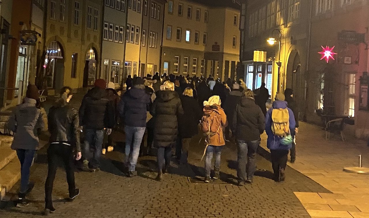 Bereits gestern hatten sich etwa vierzig Spaziergänger an der Marktkirche in der Altstadt eingefunden, um sich quasi für den traditionellen Montagsspaziergang schon einmal warm zu laufen. Heute waren erstmals mehrere Trommeln, diverse Trillerpfeifen, Hupen und Rasseln im Zug, der unüberhörbar seinen Weg am Stadion der Freundschaft und der Friederikentherme entlang nahm, um dann durchs Klagetor und am Rosengarten vorbei schließlich wieder in die Altstadt zurückzukehren. Polizeibeamte waren in Bad Langensalza nicht begleitend vor Ort; offensichtlich sahen die örtlichen Ordnungshüter anders als heute in Mühlhausen kein großes Gefahrenpotential in den friedlichen Spaziergängern
