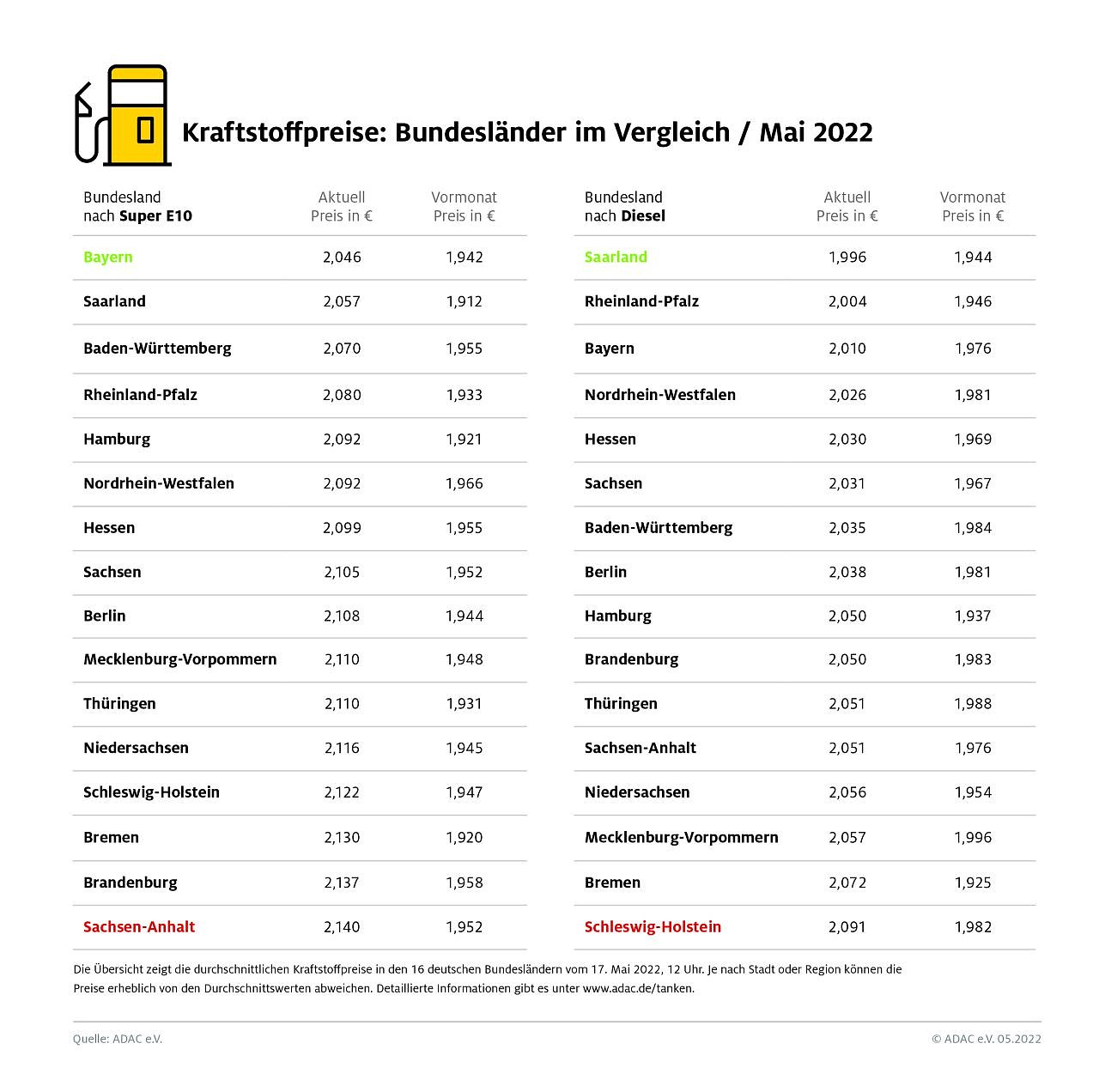 Am preiswertesten tankt man in Bayern und im Saarland. Super E10 ist in Bayern mit 2,046 Euro am günstigsten, gefolgt vom Saarland mit 2,057 Euro und Baden-Württemberg mit 2,070 Euro. Am teuersten ist der Ottokraftstoff in Sachsen-Anhalt mit 2,140 Euro je Liter – das sind 9,4 Cent mehr als in Bayern.