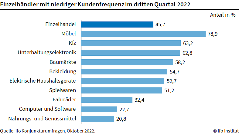 „Wegen der hohen Inflationsraten können sich gerade einkommensschwache Menschen weniger leisten und sind zurückhaltend mit Einkäufen“, ergänzt Wohlrabe. Besonders betroffen waren die Möbelhäuser – 80 Prozent der befragten Unternehmen berichteten davon, dass weniger Kunden kamen.