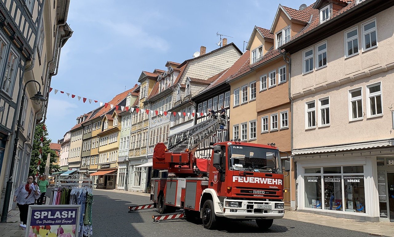 Die Feuerwehr Bad Langensalza beseitigte heute die rotweißen Wimpel, welche die Innenstadt während des Festes geschmückt haben.