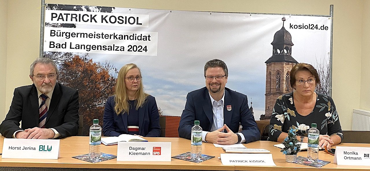 Deren starke Frauen an der Spitze waren zur Pressekonferenz vertreten und begründeten ihre Unterstützung: Die Entwicklung der Stadt ist in Schieflage geraten und es muss dringend etwas geändert werden. Wir unterstützen Patrick Kosiol, damit es wieder Ziele und Visionen für die Stadt gibt und wir positiv nach vorn schauen können, erklärte Monika Ortmann von den örtlichen LINKEN und Dagmar Kleemann (SPD) stimmte ihr zu: Ich habe schon vor sechs Jahren gewarnt, dass uns Stillstand droht. Damals fand ich es schade, dass Patrick nicht genügend Stimmen für einen Stadtratsposten erhielt. Seit August haben wir nun verhandelt und uns sozusagen als Opposition auf die Unterstützung seiner Kandidatur verständigt. Sie selbst habe momentan keine Kraft zu kandidieren, sagte Kleemann, und die inhaltlichen Differenzen ihrer Partei zur Bürgerinitiative BLU seien überschaubar. Die letzte Bürgermeisterwahl sei ungünstig verlaufen, ergänzte Monika Ortmann und ihre LINKE-Fraktion habe sich deshalb entschlossen, keinen eigenen Kandidaten ins Rennen zu schicken, sondern Patrick Kosiol zu unterstützen, um die Kräfte zu bündeln.