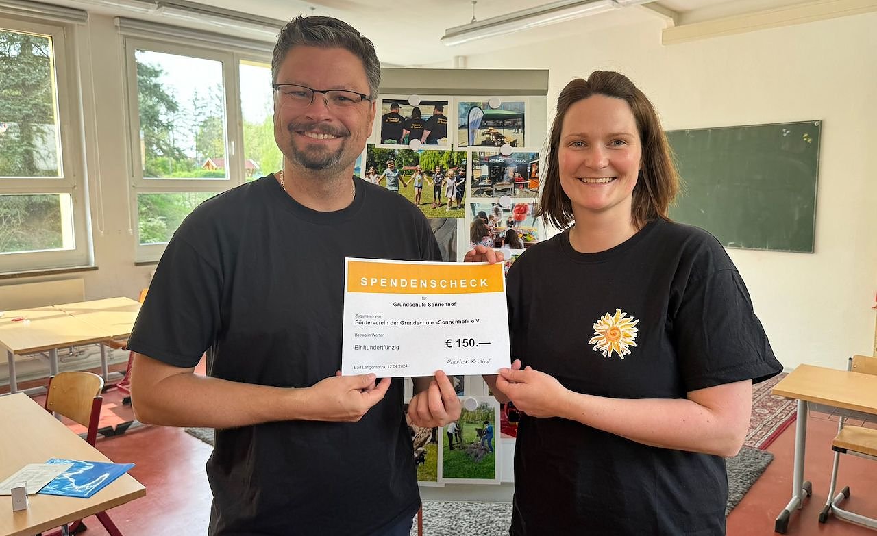 Autor: redPatrick Kosiol, langjähriges Mitglied und Förderer unseres Fördervereins, engagierter Papa und ein aussichtsreicher Kandidat für die Wahl des neuen Bürgermeisters unserer Stadt, nutzte die Gelegenheit und spendete dem Förderverein 150 Euro. Geld, dass der Förderverein sehr gut gebrauchen kann, sagte Evelyn Schreiber ( stellvertretende Vorsitzende), denn am 17.August findet wieder das traditionelle Sommerfest der Sonnenhofschule statt.