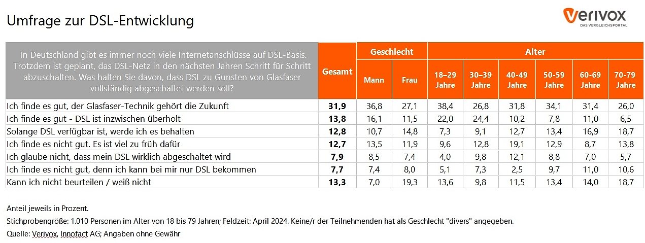Die verwendeten Daten basieren auf einer Online-Umfrage der Innofact AG im Auftrag von Verivox, an der im April 2024 insgesamt 1.010 Personen teilnahmen. Die Umfrage ist bevölkerungsrepräsentativ in Bezug auf Alter, Geschlecht und Bundeslandzugehörigkeit. Gefragt wurde: In Deutschland gibt es immer noch viele Internetanschlüsse auf DSL-Basis. Trotzdem ist geplant, das DSL-Netz in den nächsten Jahren Schritt für Schritt abzuschalten. Was halten Sie davon, dass DSL zu Gunsten von Glasfaser vollständig abgeschaltet werden soll?