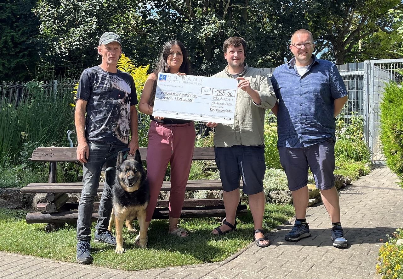 155 Euro für das Tierheim Mühlhausen – mit einem großen symbolischen Scheck konnten die beiden Pfarrer Marcus Ebert und Benjamin Themel am Freitag die Spende an Katharina Funk und einen Mitarbeiter des Tierschutzvereins übergeben...