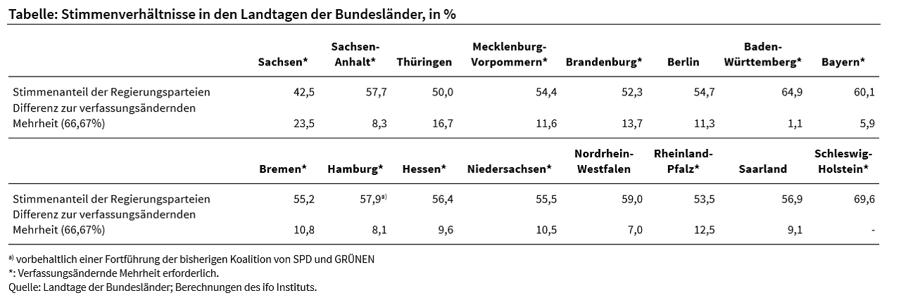Eine verfassungsändernde Mehrheit haben nur die Regierungsparteien in Schleswig-Holstein. Überall sonst muss die Regierung eine Verständigung mit den Oppositionsparteien herbeiführen. In Brandenburg wäre sogar die Zustimmung von mindestens einem AfD-Abgeordneten erforderlich. Angesichts dieser Konstellationen wird die Schuldenbremse für die Länder nicht so schnell aufgehoben werden. Vielerorts wird man wohl bestenfalls nach den nächsten Landtagswahlen verfassungsändernde Mehrheiten zustande bekommen, sagt Ragnitz.