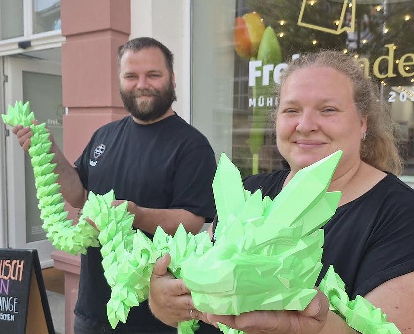 Autor: redNoch bis Anfang Juli stehen die beiden im Frei.Handel hinter der Theke – mit einem Sortiment, das ganz im Zeichen des 3D-Drucks steht. Besonders beliebt: mystische Drachenfiguren, magnetische Schlangenköpfe und regenbogenbunte Fledermäuse.