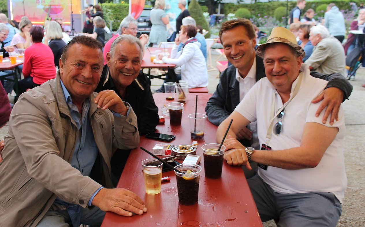 Voll besetzte Tische, Bänke, Liegestühle und andere Sitzgelegenheiten prägten das Bild im gut gefüllten Schlösschenpark am Abend. City-Managerin Sandra Czerniak antwortete auf die Frage, ob sie auch Verträge mit Petrus geschlossen hätte, schelmisch grinsend: Wieso, es ist doch Sommer. Da hat sie natürlich Recht und mit ihrer Idee von wechselnden Veranstaltungsorten für ihren SummAIR in the City absolut den Nerv der zeit getroffen. Allwöchentlich versammeln sich Einheimische und Gäste der Stadt an einem anderen Ort, um gemütlich den Feier- oder Urlaubsabend zu geniessen und unbeschwert leichter Unterhaltungsmusik zu lauschen.