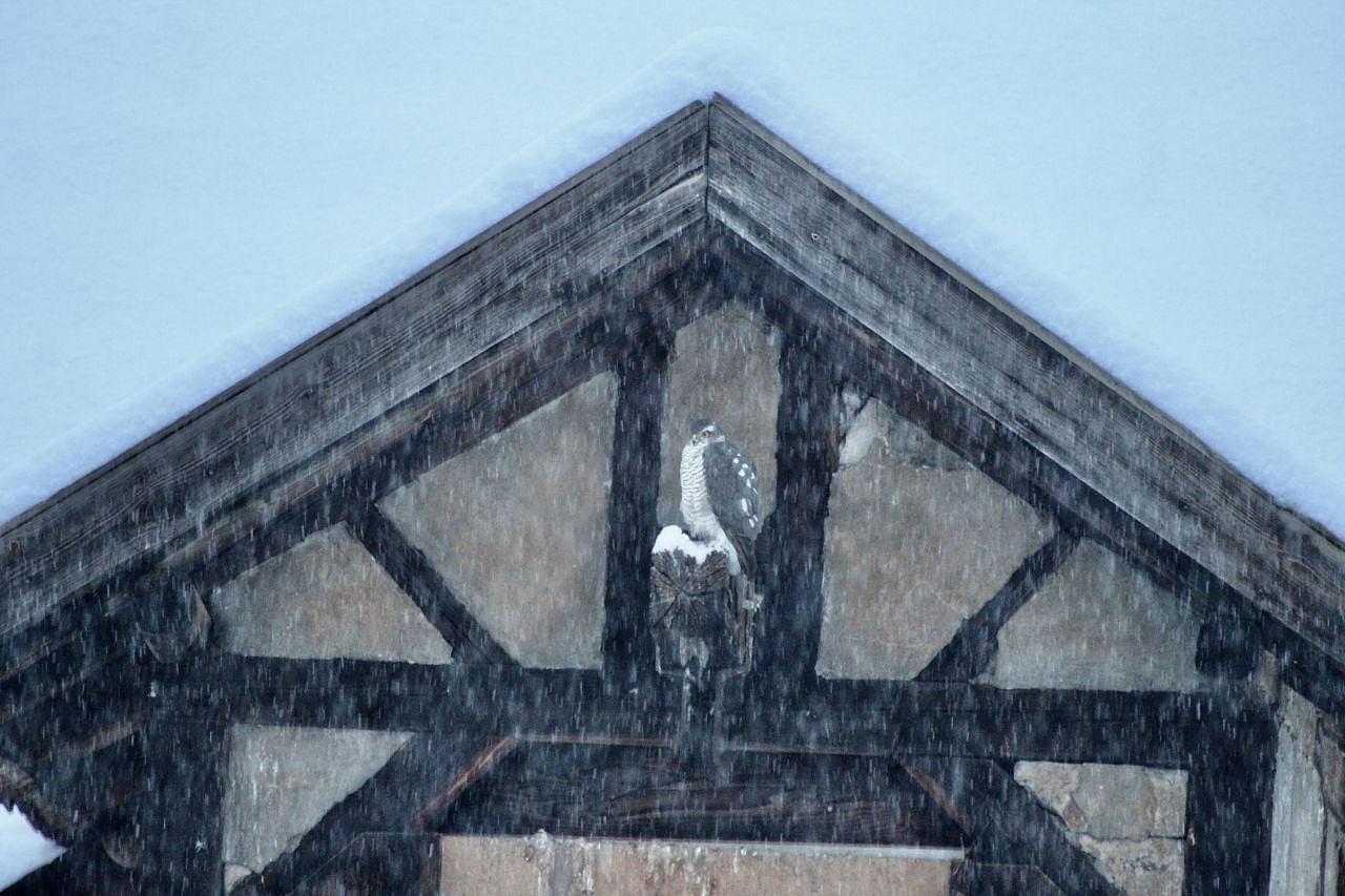 Gut getarnt im morgendlichen Schneetreiben, sitzt ein Sperberweibchen unter einem Dachgiebel in Bad Langensalza und wartet auf die Chance eine Beute schlagen zu können...