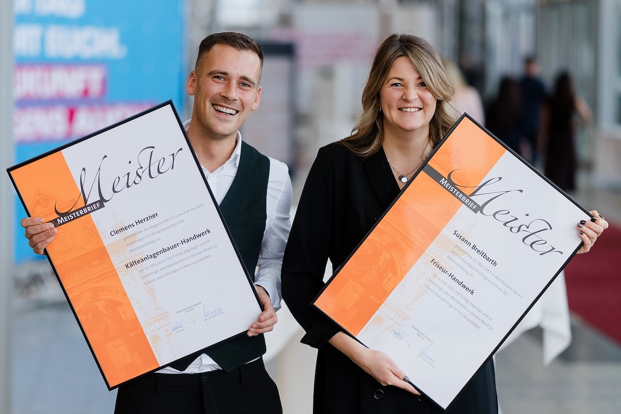 Der "Supermeister" im Kälteanlagenbauer-Handwerk - Clemens Herzner aus Bad Klosterlausnitz und Susann Breitbarth aus Mühlhausen im Friseur-Handwerk (Foto: Michael Reichel - HWK Erfurt)