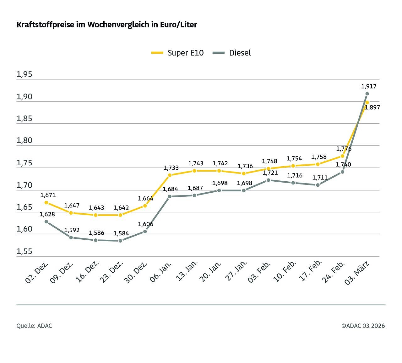 Ähnliche Preisaufschläge gab es zuletzt vor gut vier Jahren im Zuge des russischen Angriffs auf die Ukraine und die folgende Energiepreisexplosion. Die Preise sind Tagesdurchschnittspreise von Dienstag, 3. März. Aktuelle Preisbewegungen vom heutigen Tag sind dabei nicht erfasst.