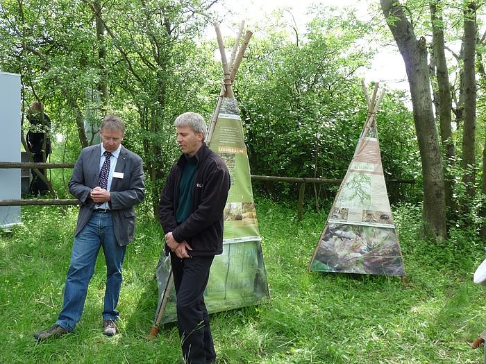 Thomas Möhling (vorn) und Naturparkchef Jörg Nonnen informierten dann die Gäste zum Thema Wildkatze in der Kyffhäuserregion, dass übrigens als kleinstes Gebirge Deutschlands gilt.